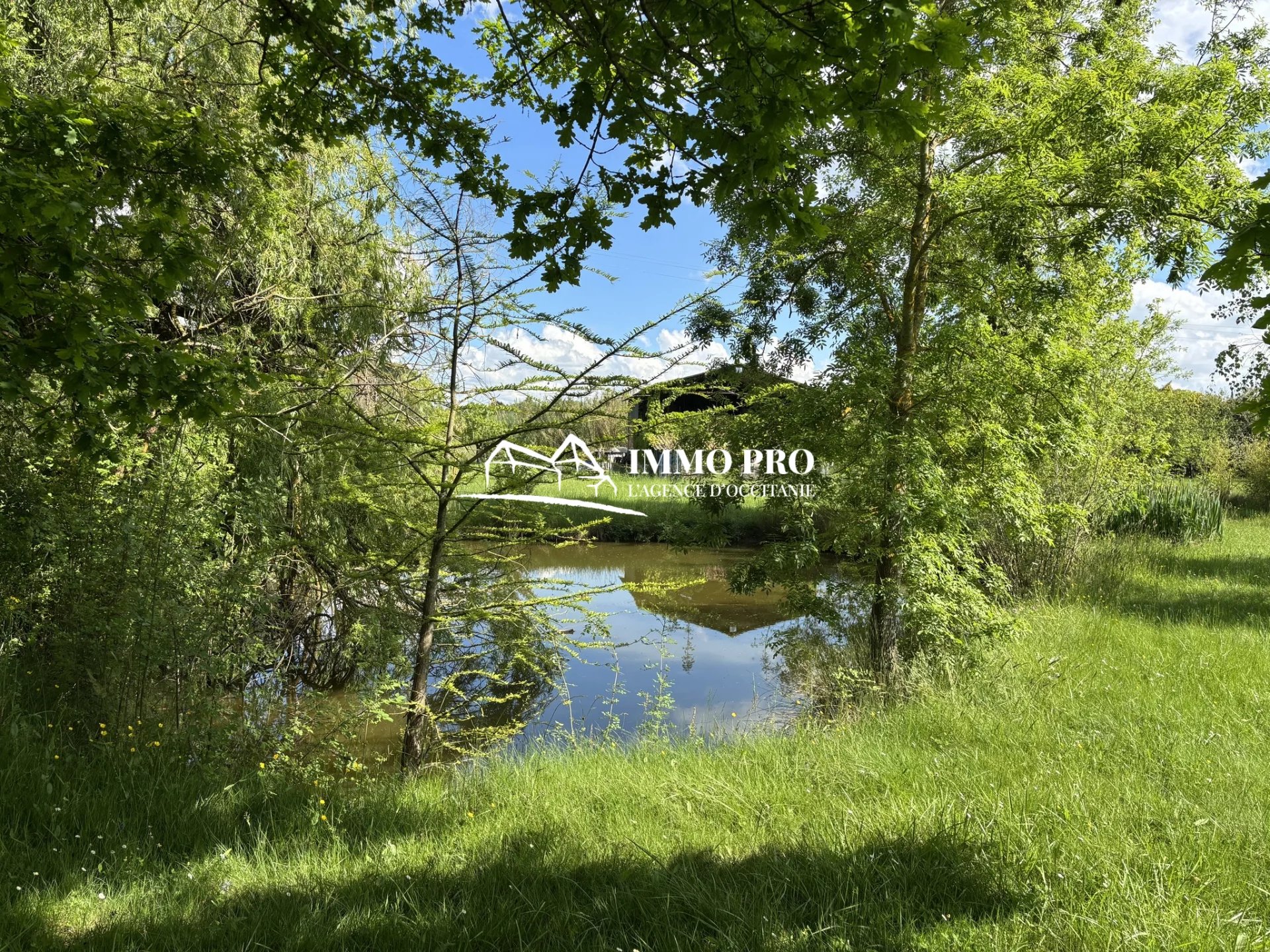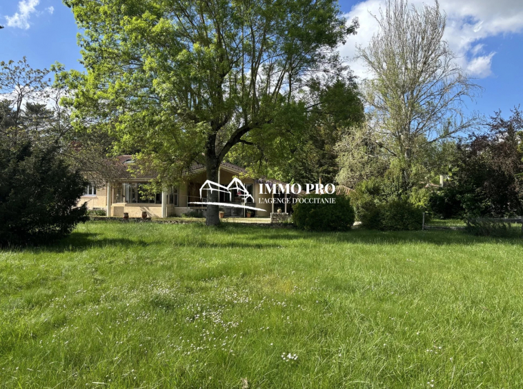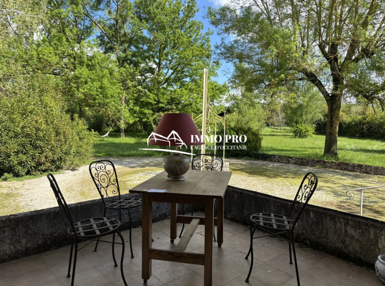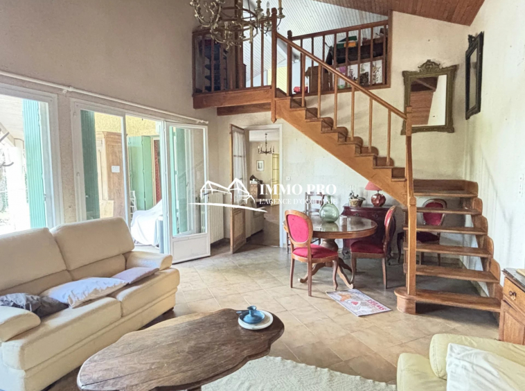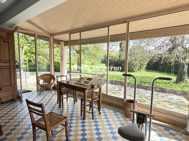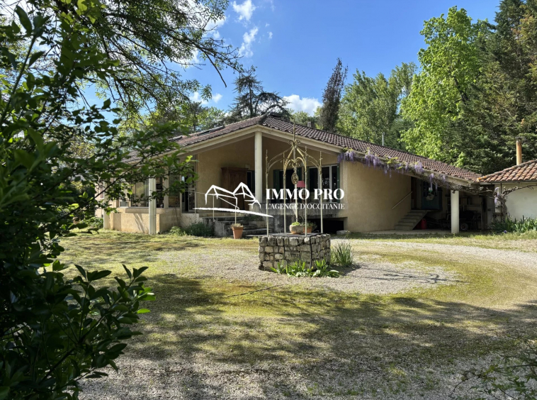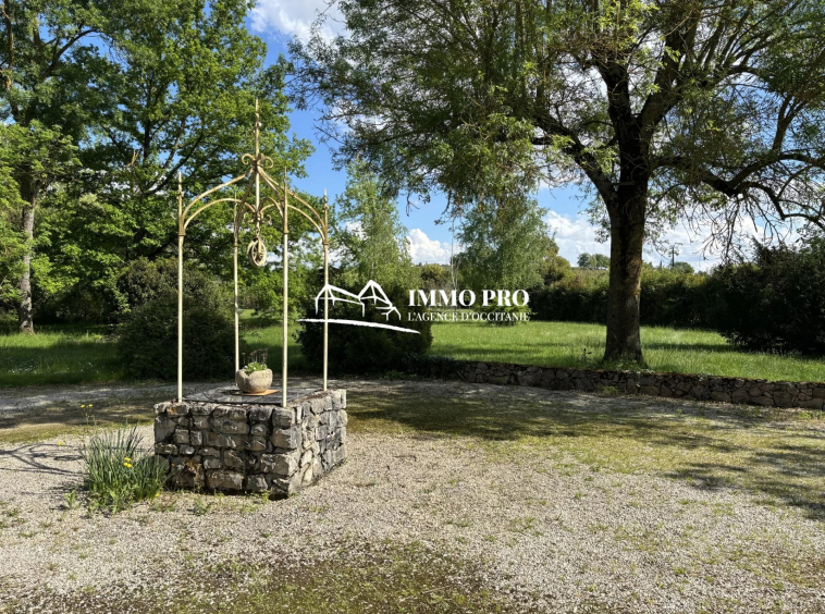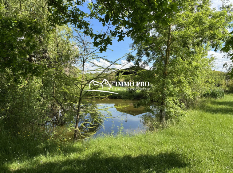 Just a few minutes from the town center, this 138m² home sits on a beautiful, tree-lined plot of approximately 1 hectare, featuring a pond and a well.