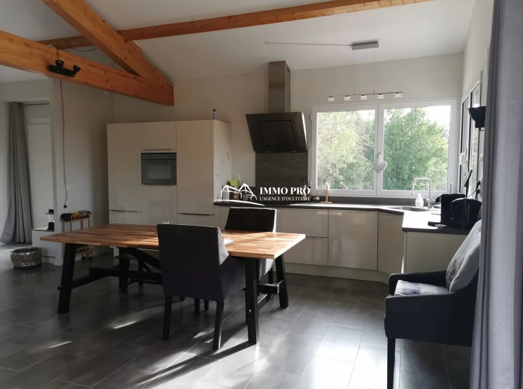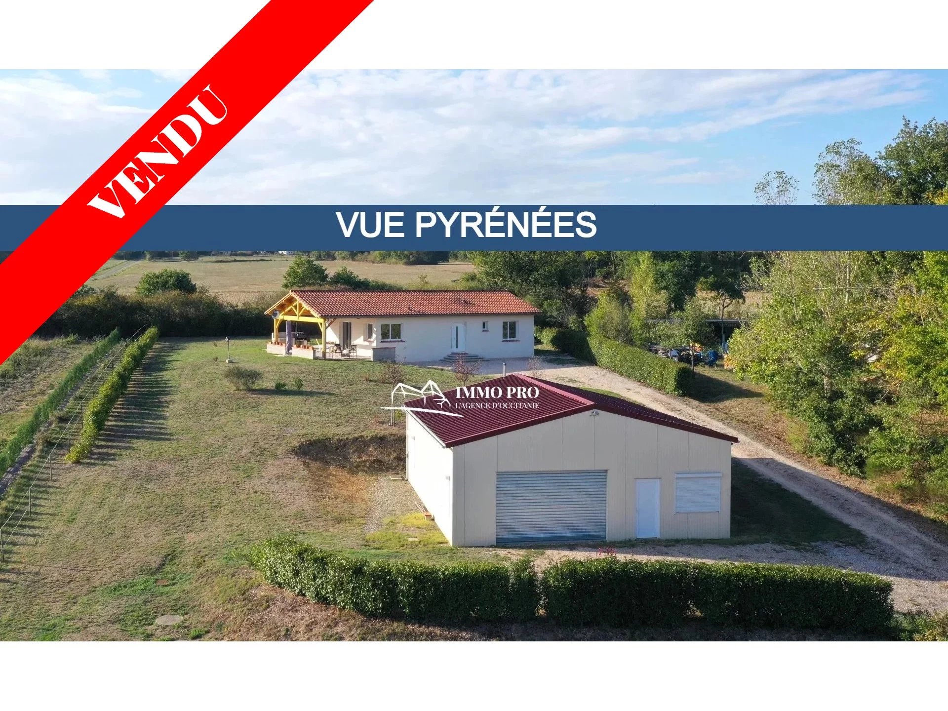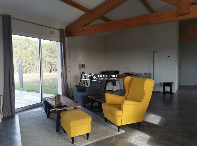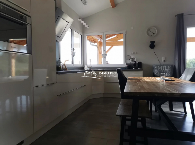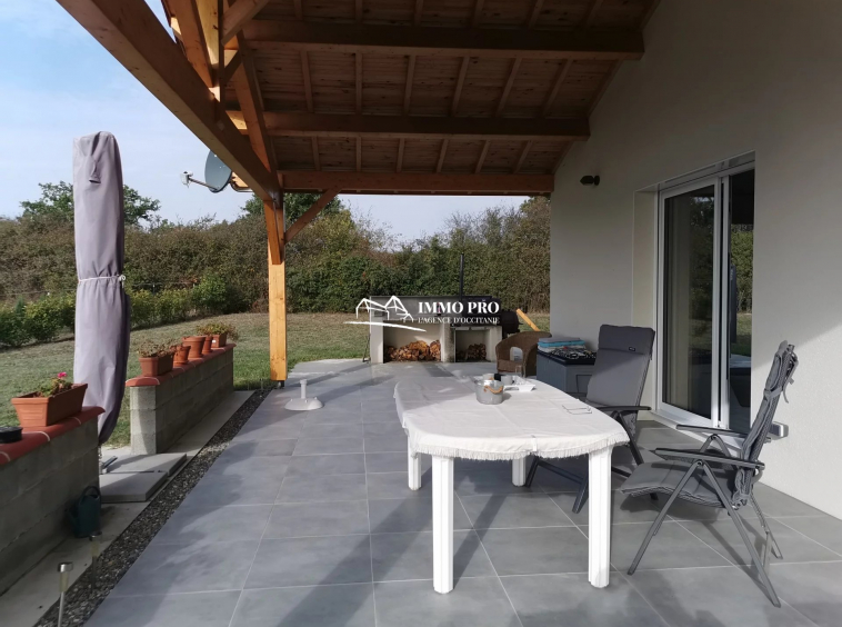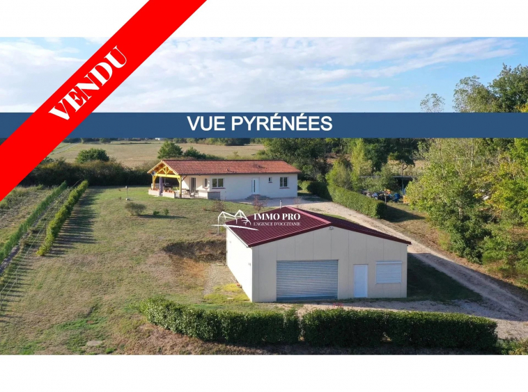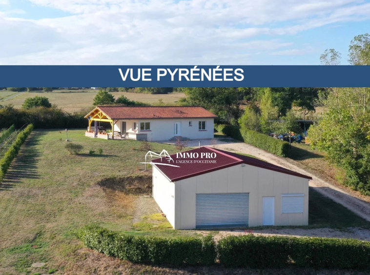 10mn from Samatan Lombez, villa built in 2014 about 100m² with large living room of 60m² and fully equipped kitchen with views of the Pyrenees, 2 bedrooms each with its own bathroom + toilet, pantry / laundry. South-facing covered patio and opened patio facing West. Underfloor heating by heat pump. Lockable metal hangar IN PERFECT CONDITION of 120m² with car lift, roller shutter, and seperate lockable room (office, toilet, shower). Sanitation to standards. Out of sight of neighbourgs. Countryside environment.