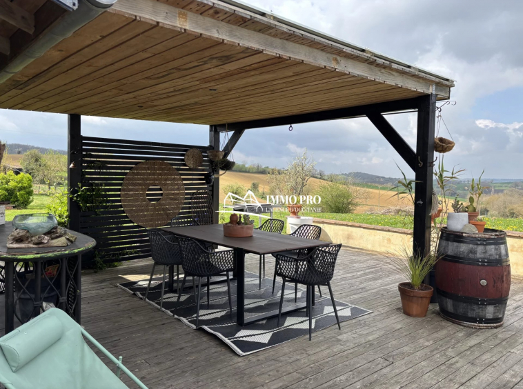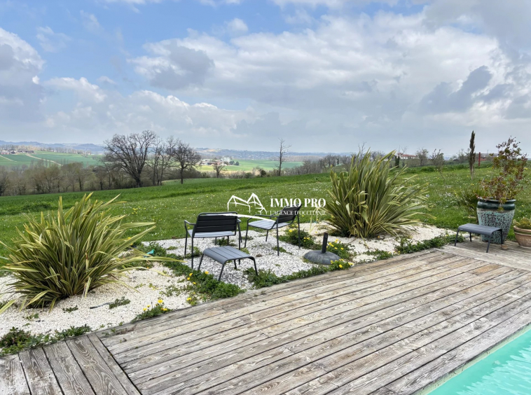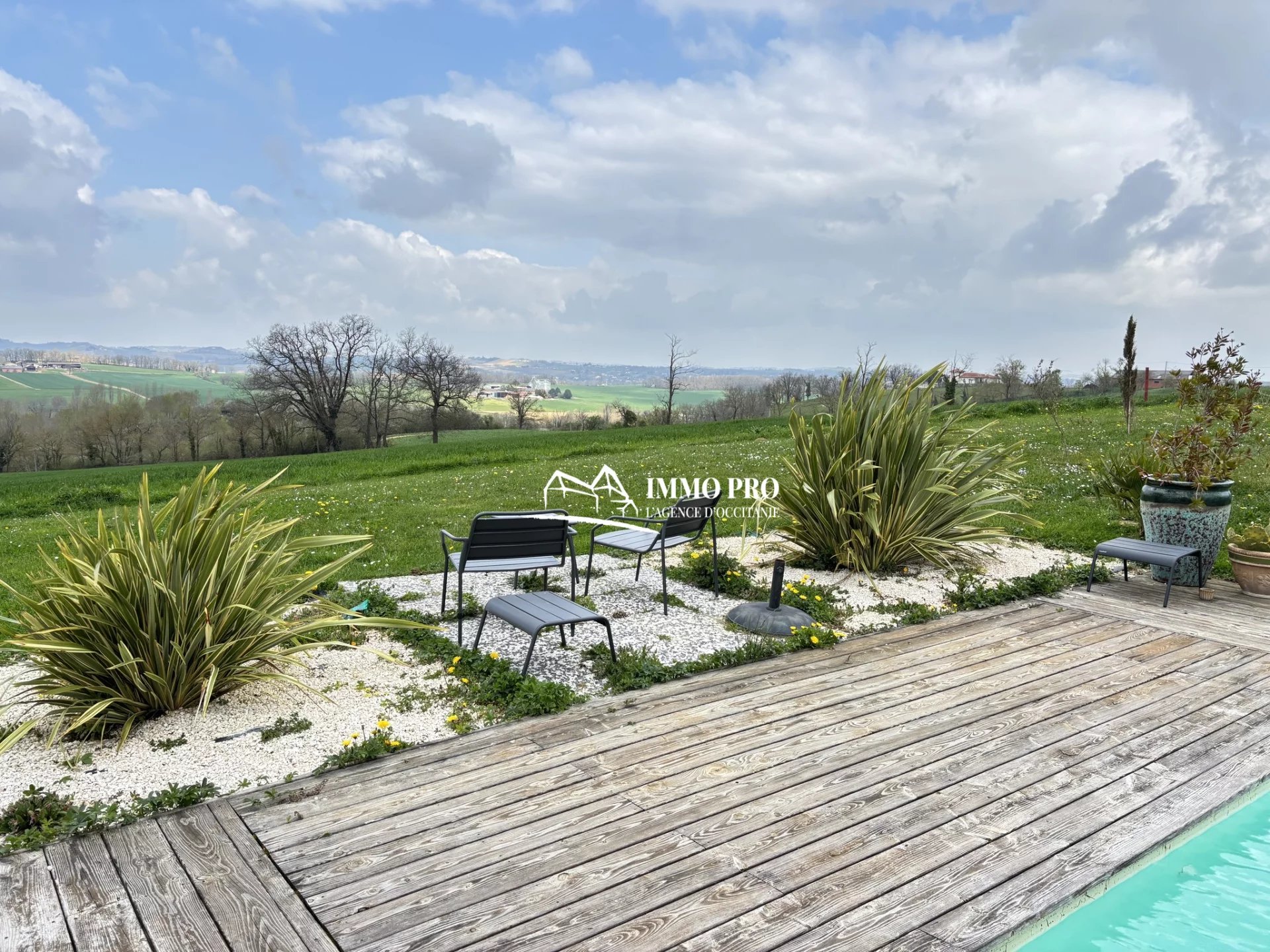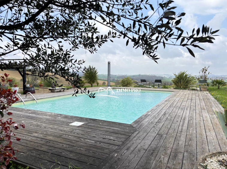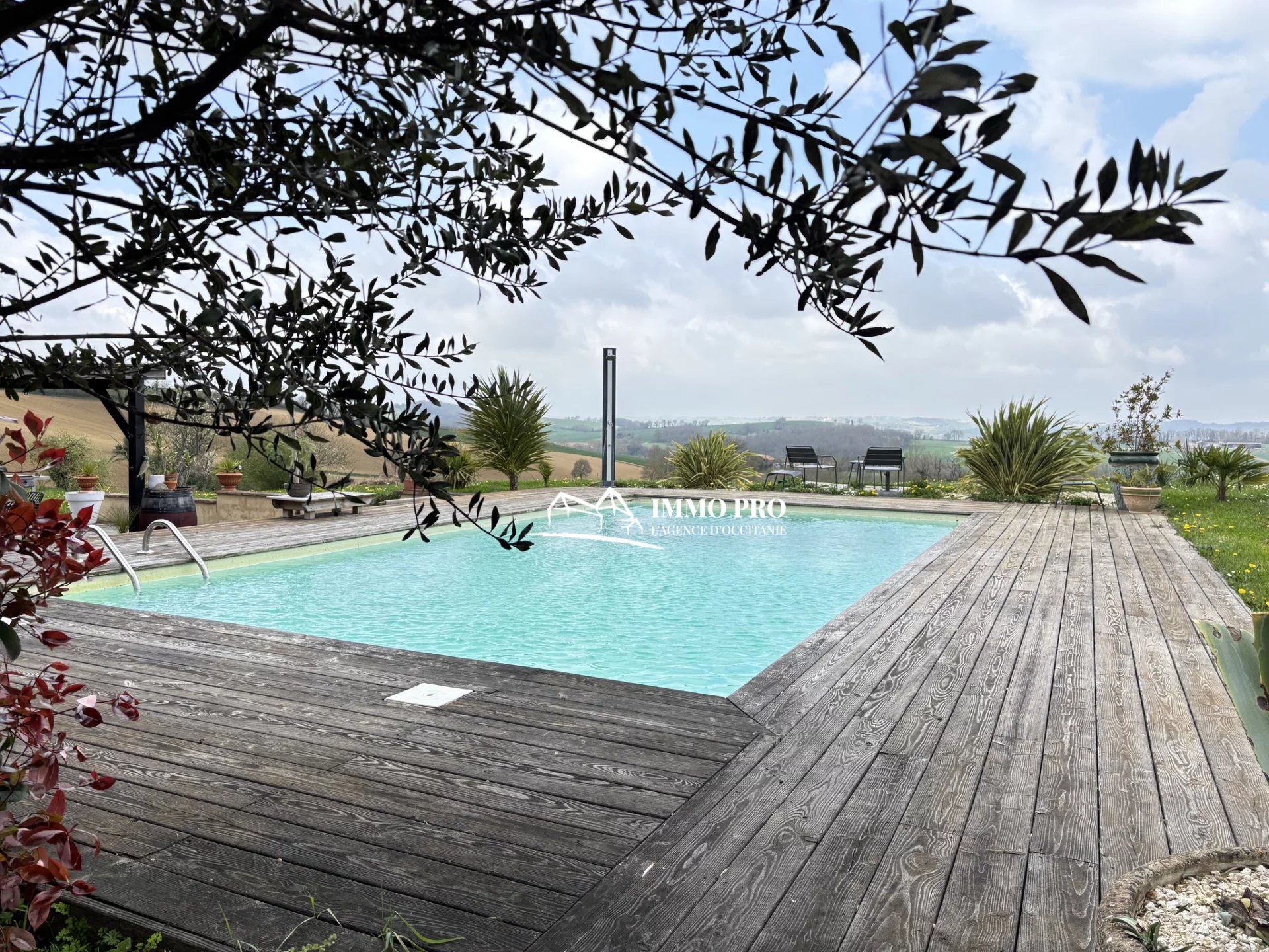 Large wooden terrace with a swimming pool and stunning views of the surrounding countryside.