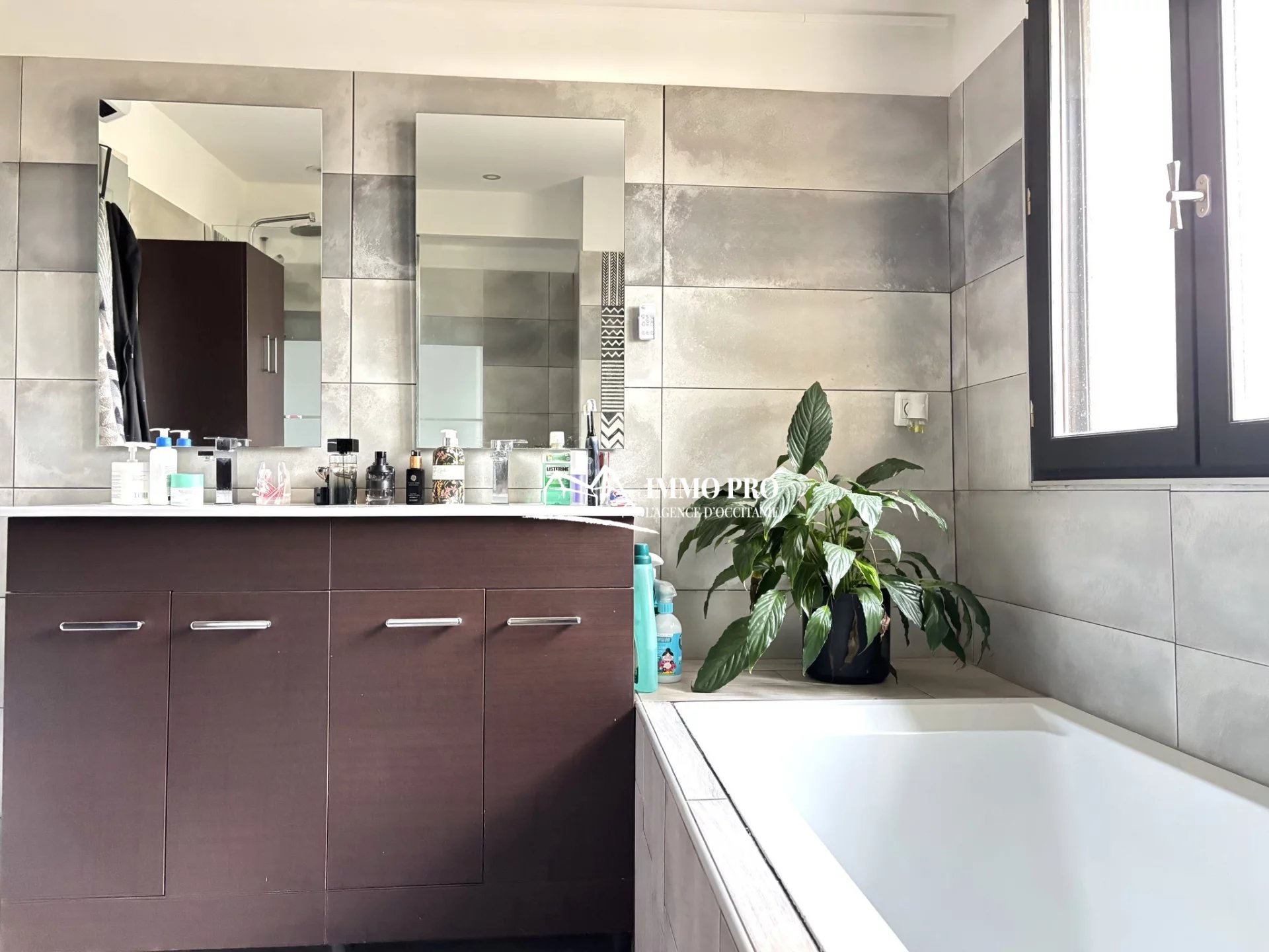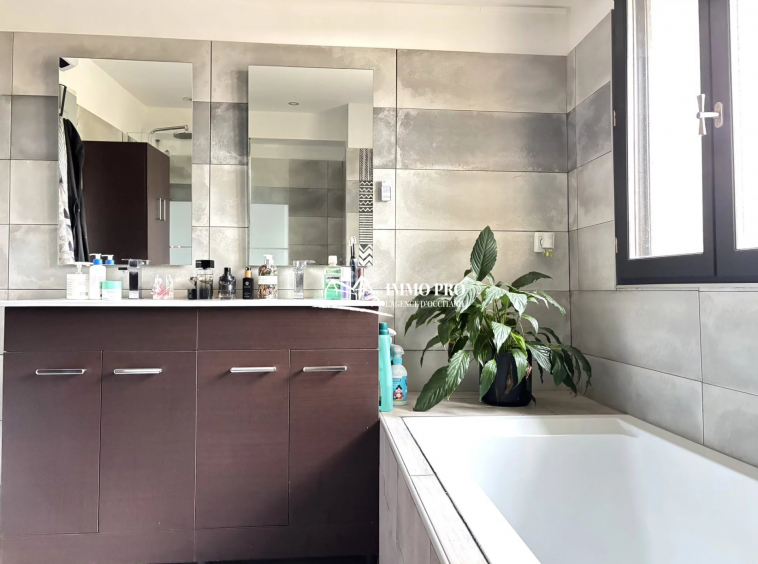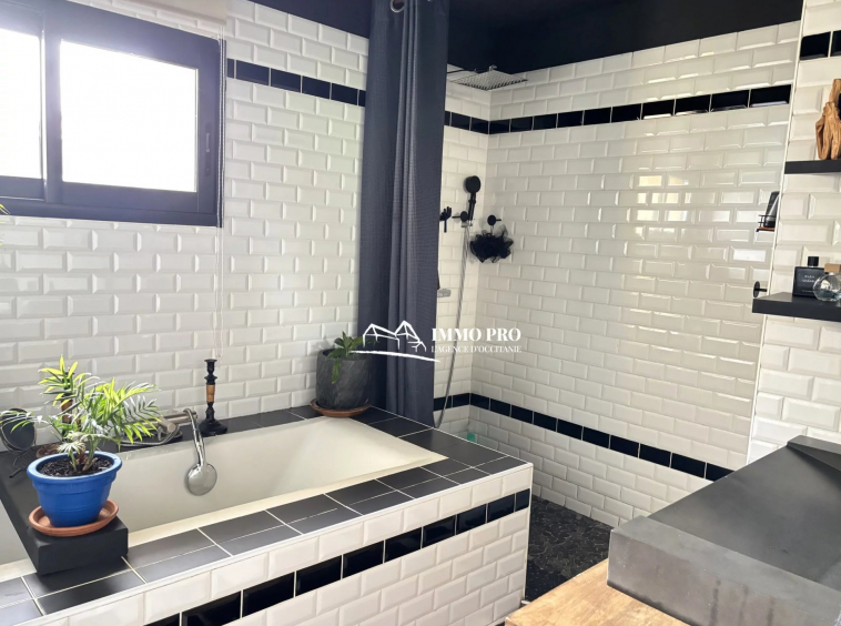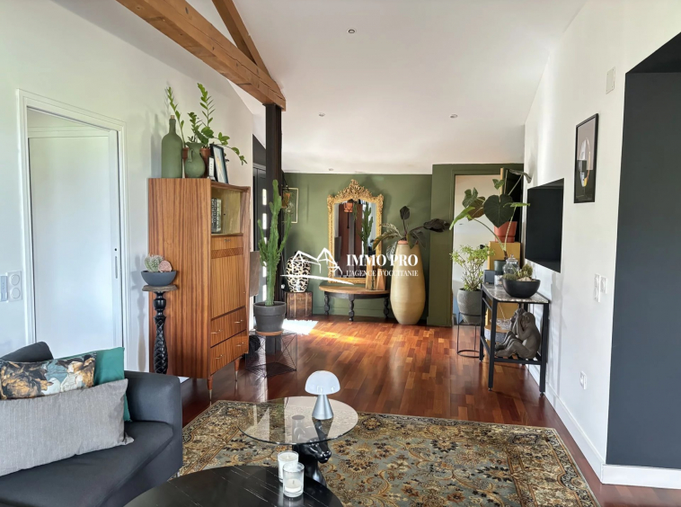 Living room with an open-plan equipped kitchen, 2 bedrooms, a bathroom with both shower and bathtub, a laundry room, and separate toilets.