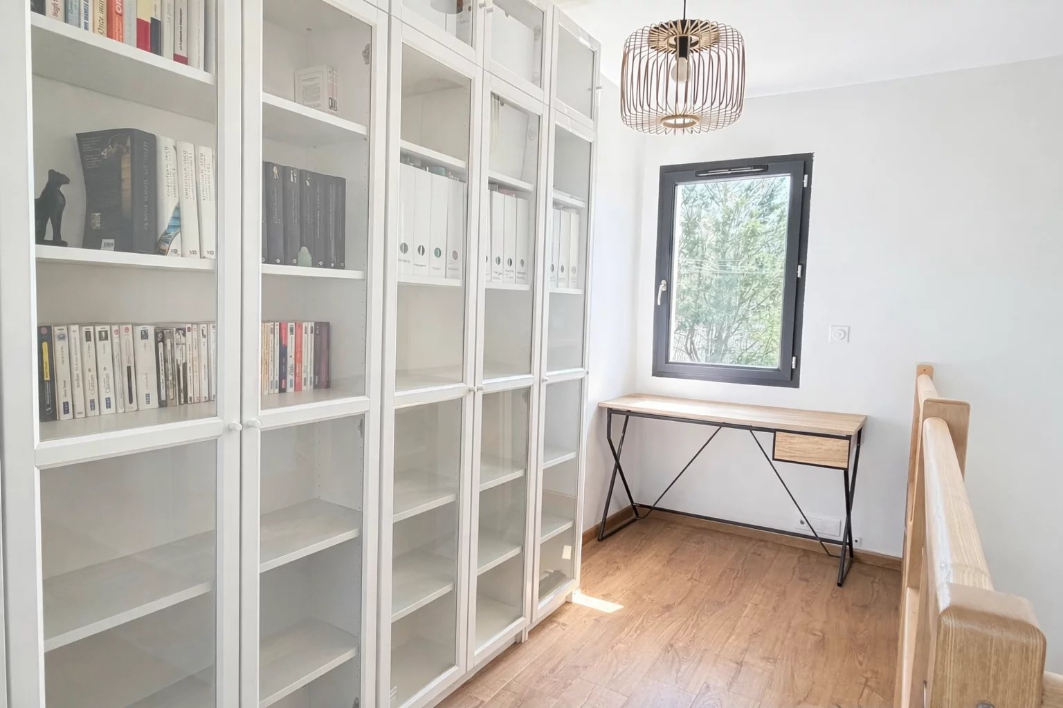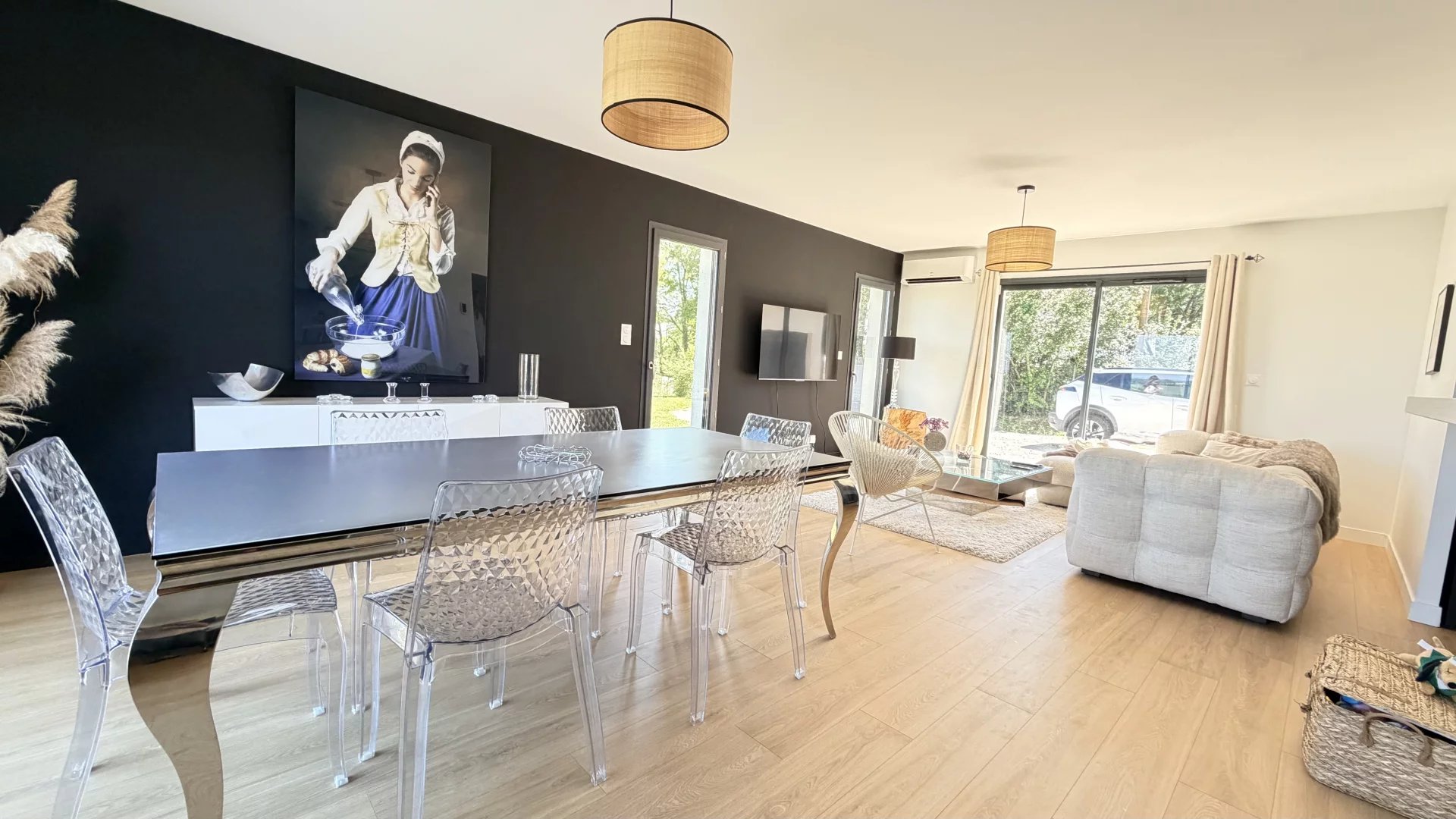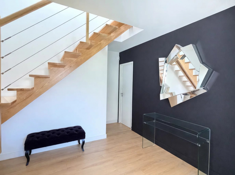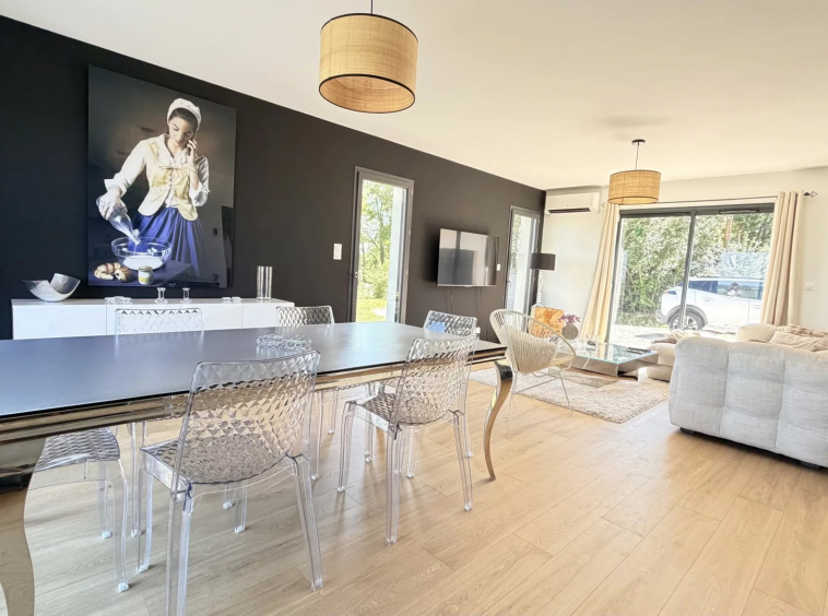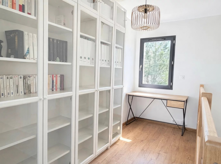 Au rez-de-chaussée, belle entrée, séjour lumineux avec cuisine ouverte, une suite parentale (Chambre avec dressing et salle d’eau), toilettes, buanderie; A l’étage, espace bureau, deux chambres, salle d’eau et toilettes.