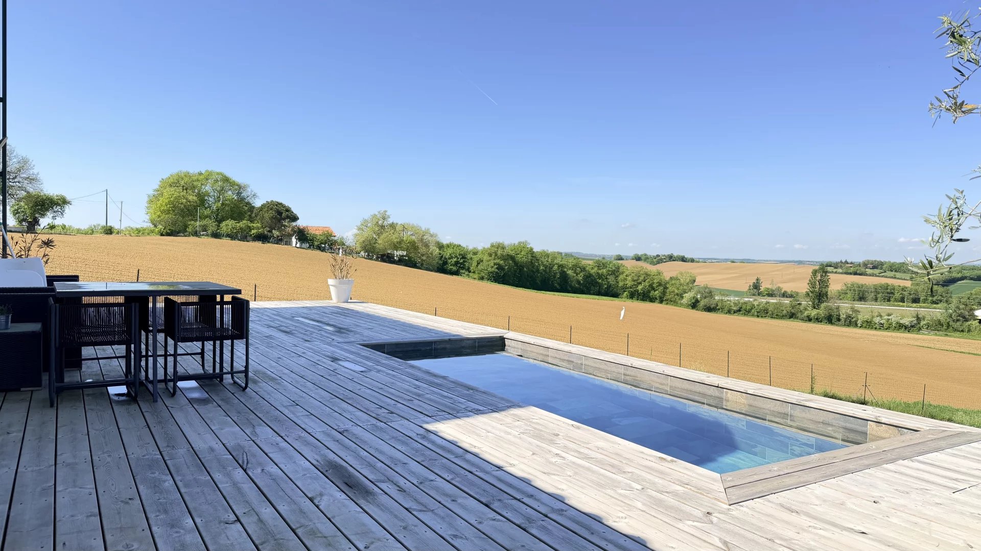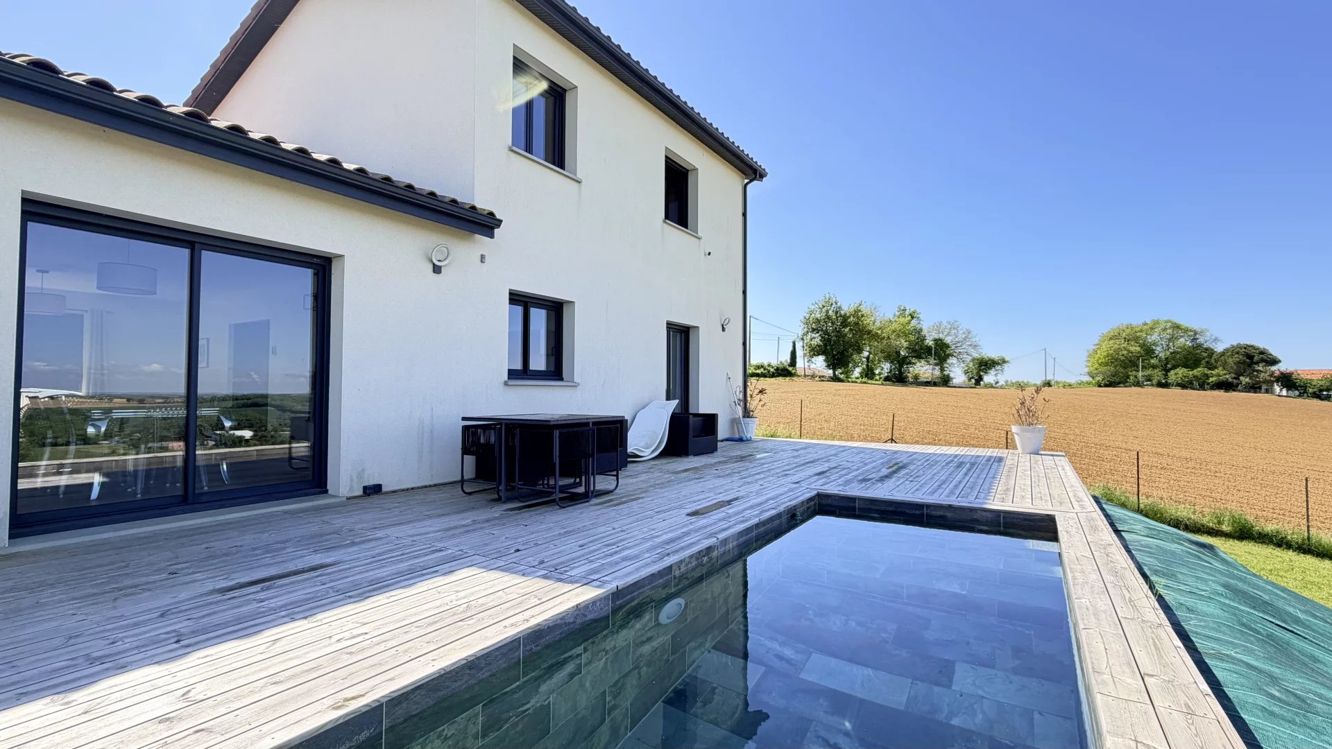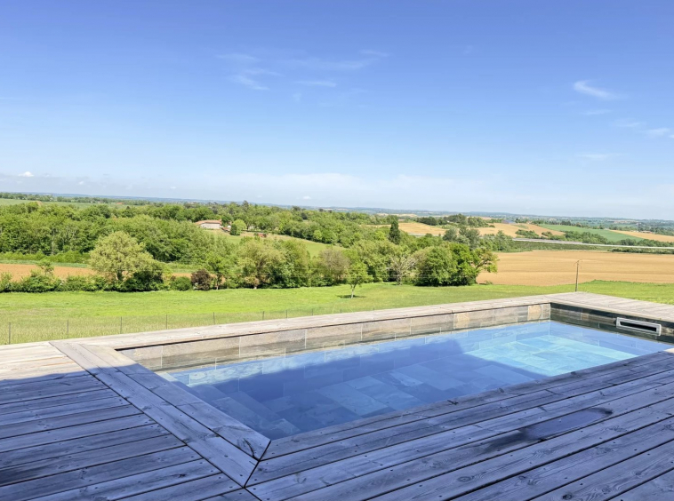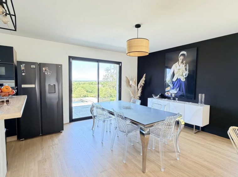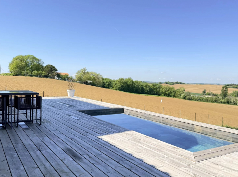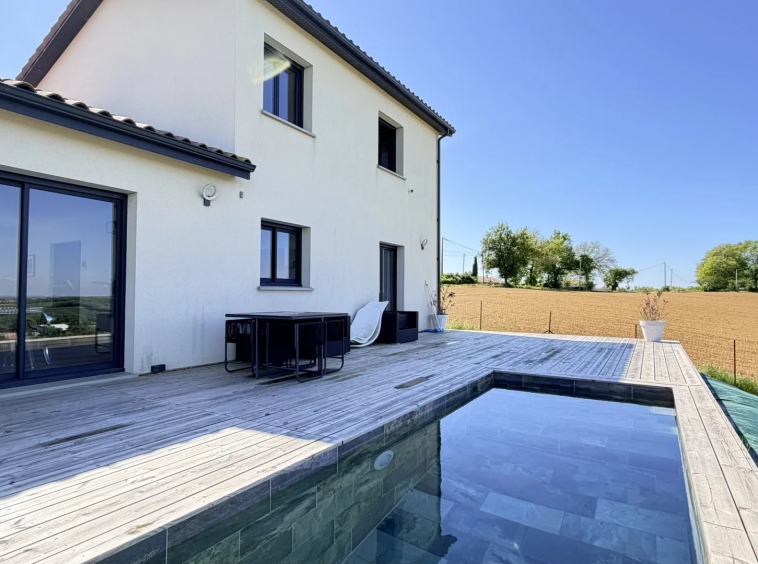 A 5mn du centre-ville de Gimont, Villa de 2019 de 117m² habitables sur un joli terrain de 1.500m² clôturé avec sa piscine en pierre de Bali. Très belle vue sur la campagne Gersoise. Aucun vis-à-vis.