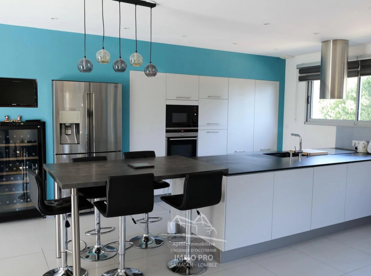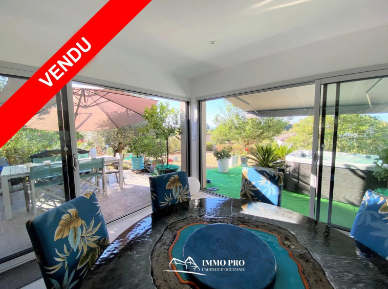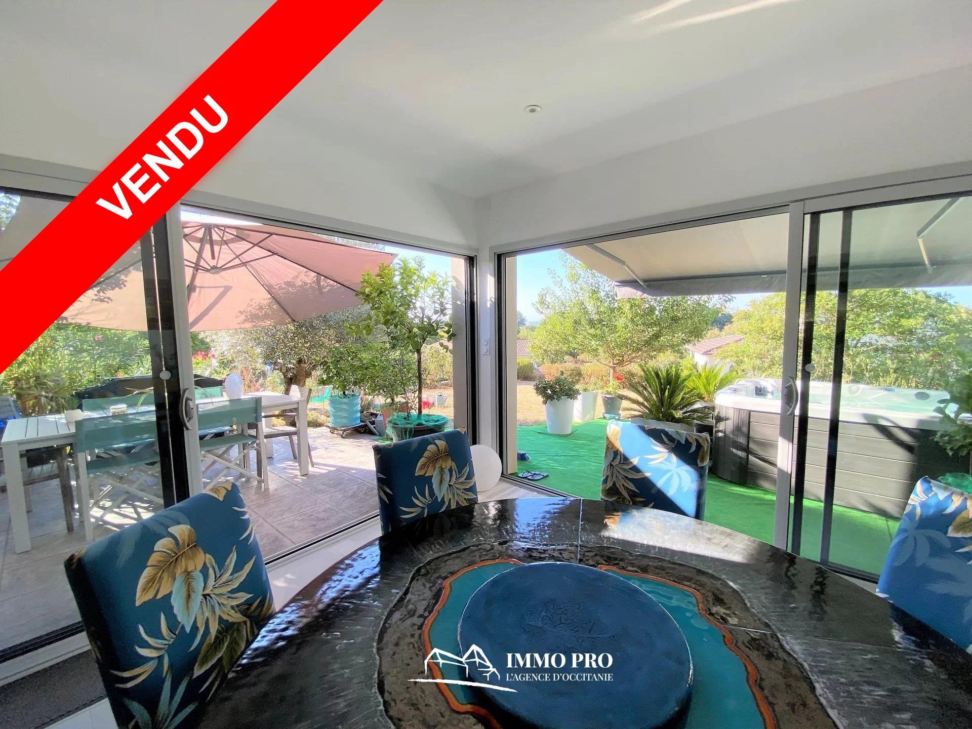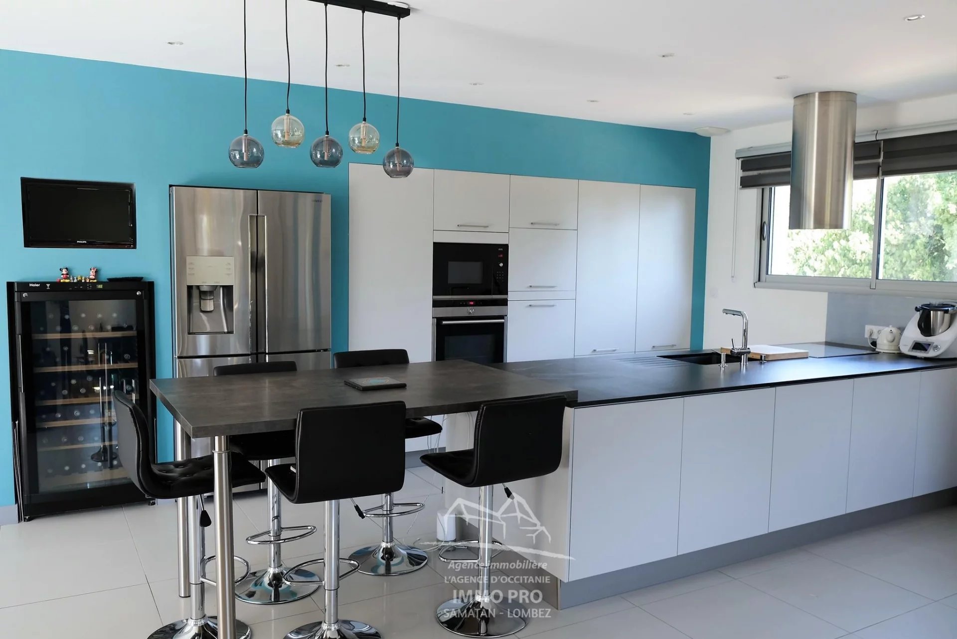 A SAMATAN, BELLE LUMINOSITE pour cette villa de plain-pied, en position dominante, d’environ 118m² habitables. Cuisine équipée haut-de-gamme ouverte sur le séjour, véranda, sur terrasses (Est et Sud) avec SPA et Vue Pyrénées, 2 chambres dont 1 suite salle d’eau/dressing, bureau, cellier, wc.