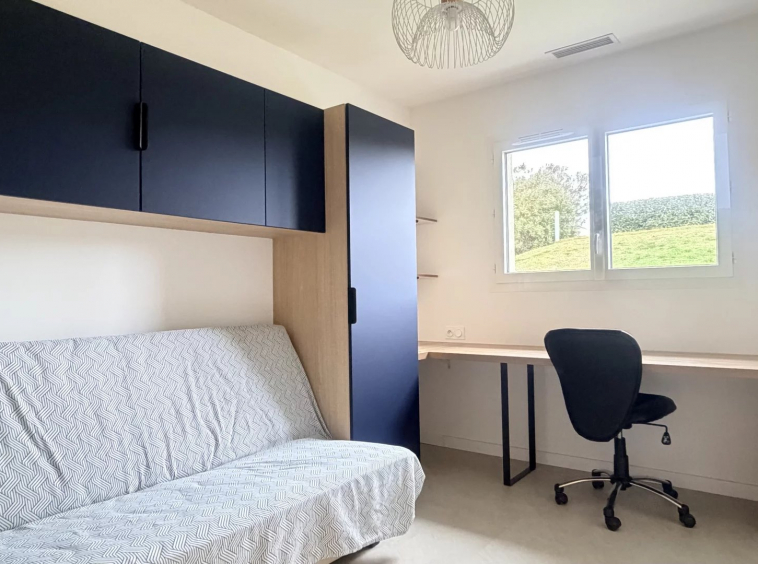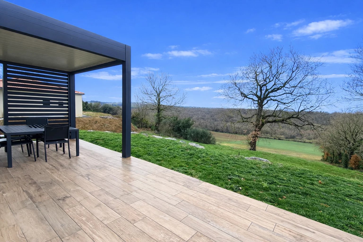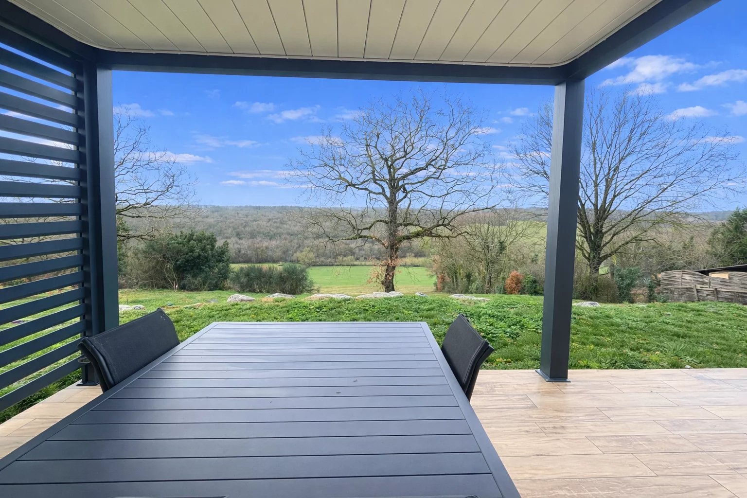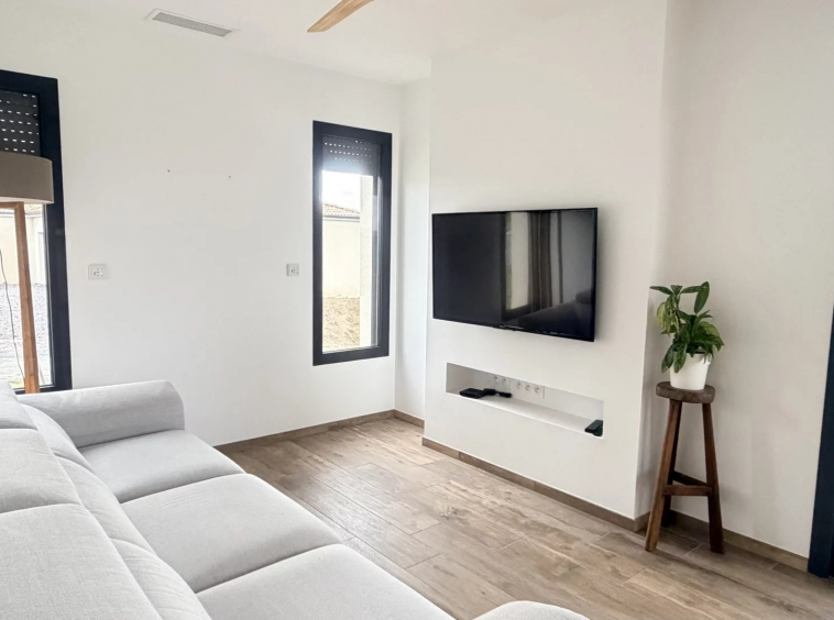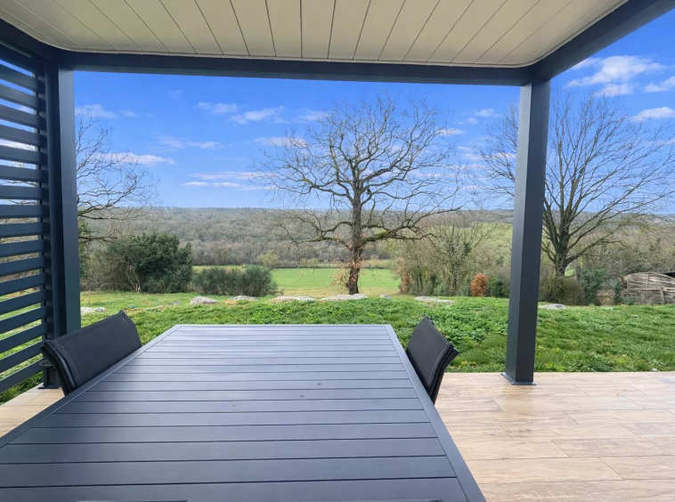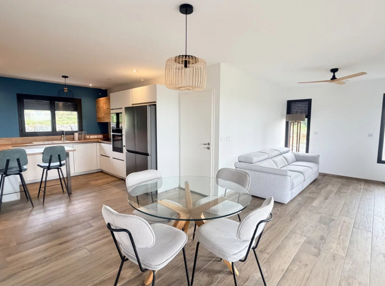 Entrée avec placards, cuisine entièrement équipée ouverte sur le séjour avec accès direct sur une terrasse exposée Sud et sa pergola bioclimatique, 3 chambres, salle d’eau et toilettes.