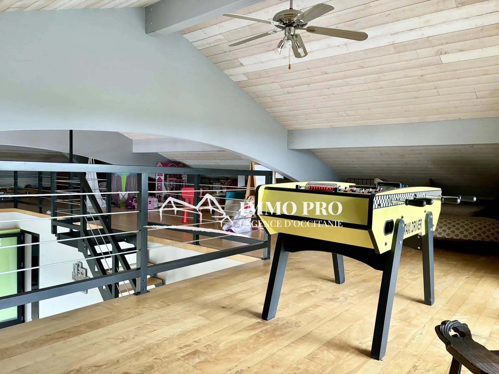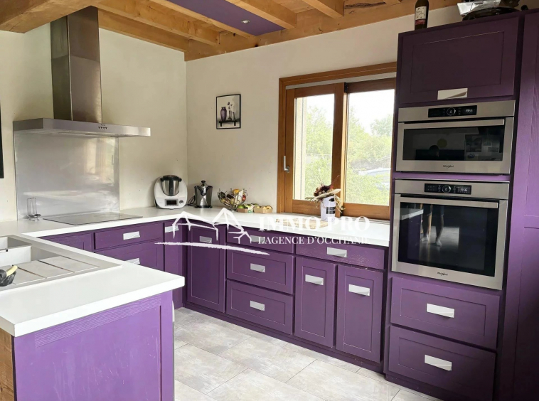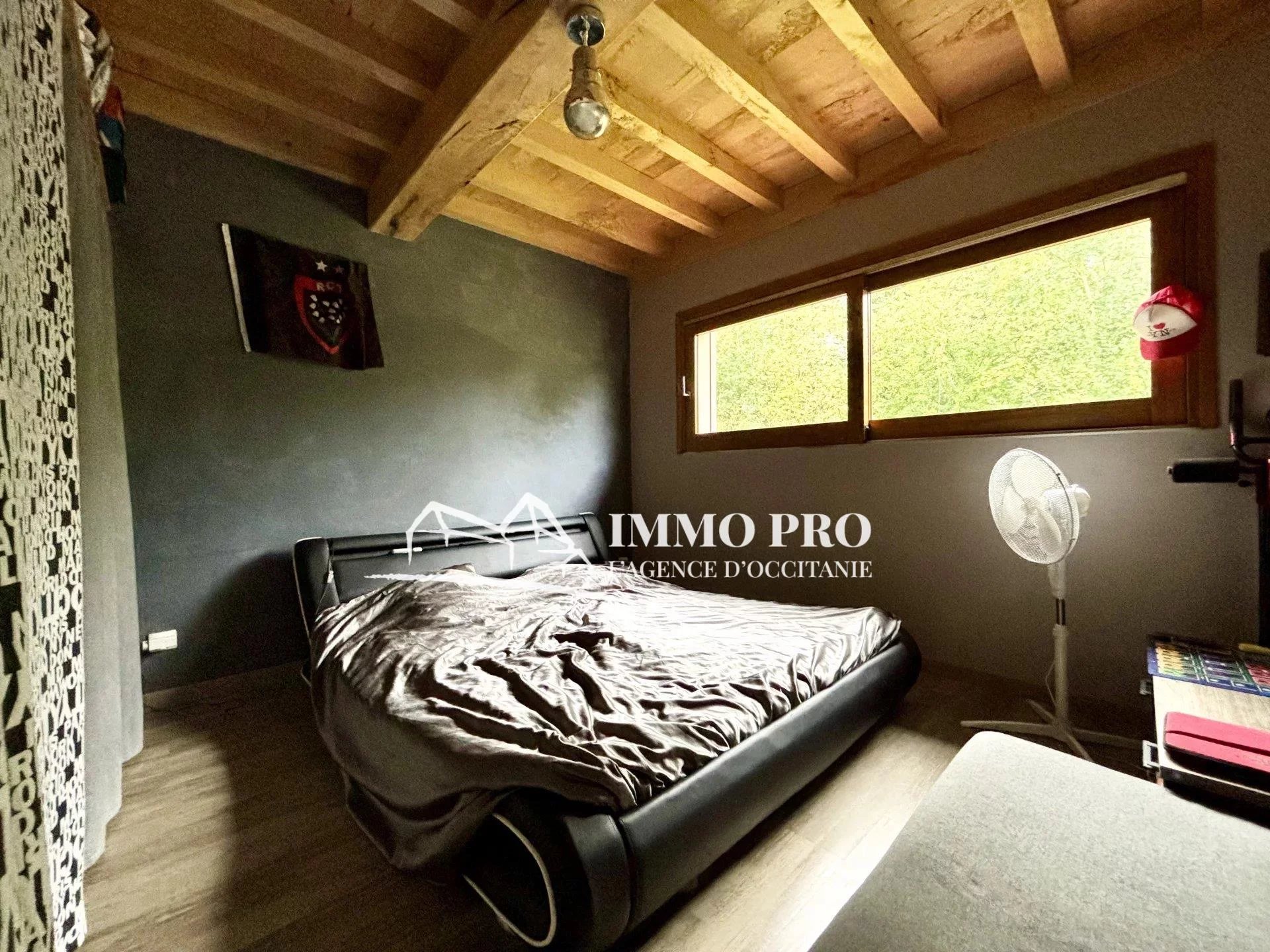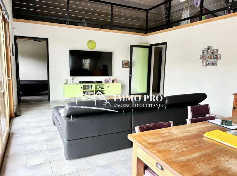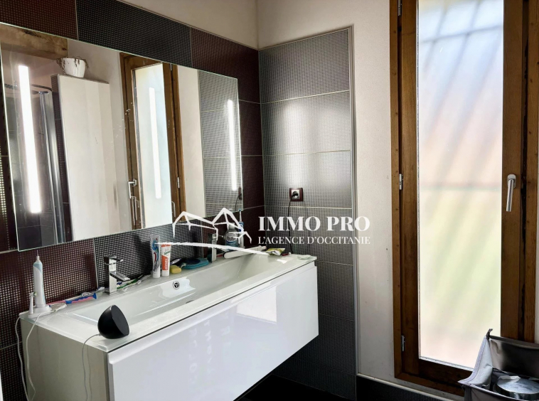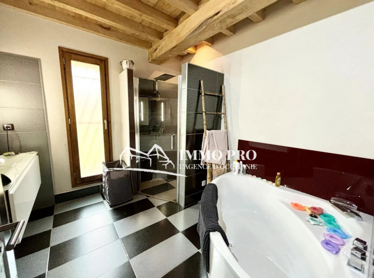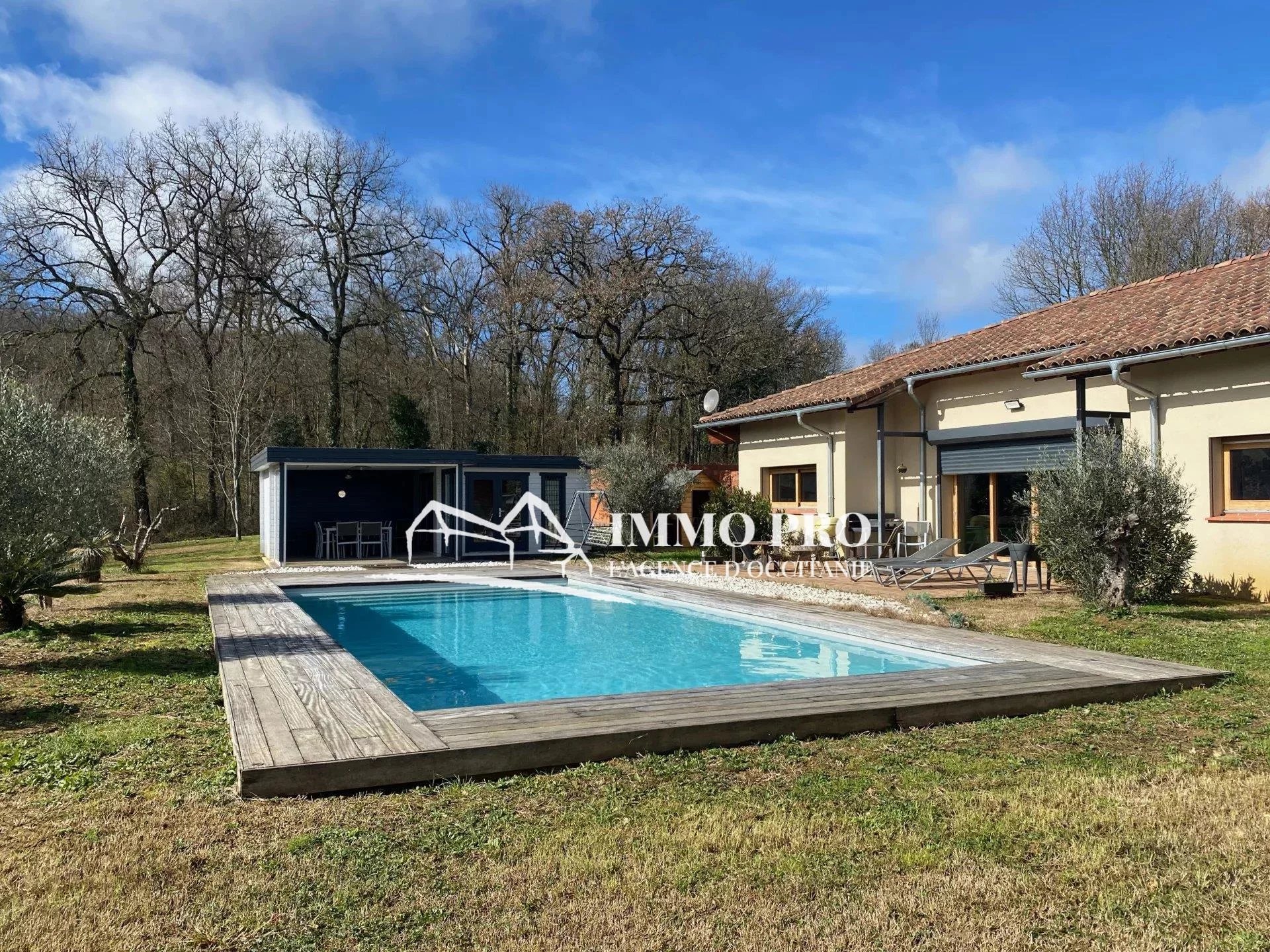 A 5mn de Gimont, Villa de plain-pied de 2010 – Belle entrée (placards), spacieux séjour avec toit cathédrale donnant sur une terrasse avec piscine exposée Sud, cuisine équipée, 4 chambres, dont une avec sa salle d’eau, salle de bains avec douche italienne et baignoire, 2 toilettes. A l’étage, grande mezzanine.