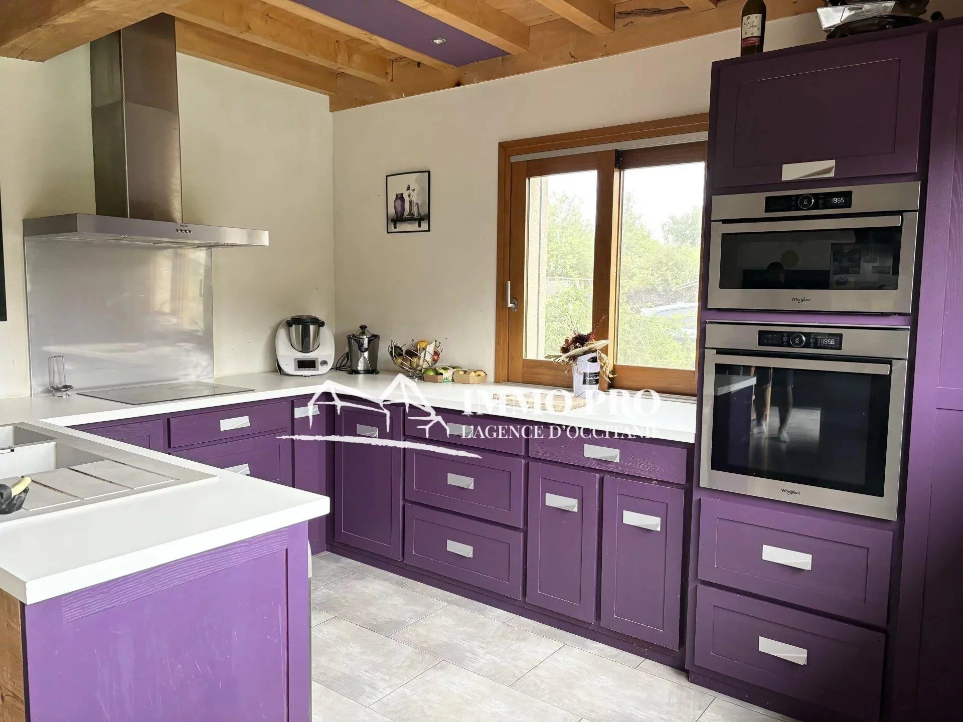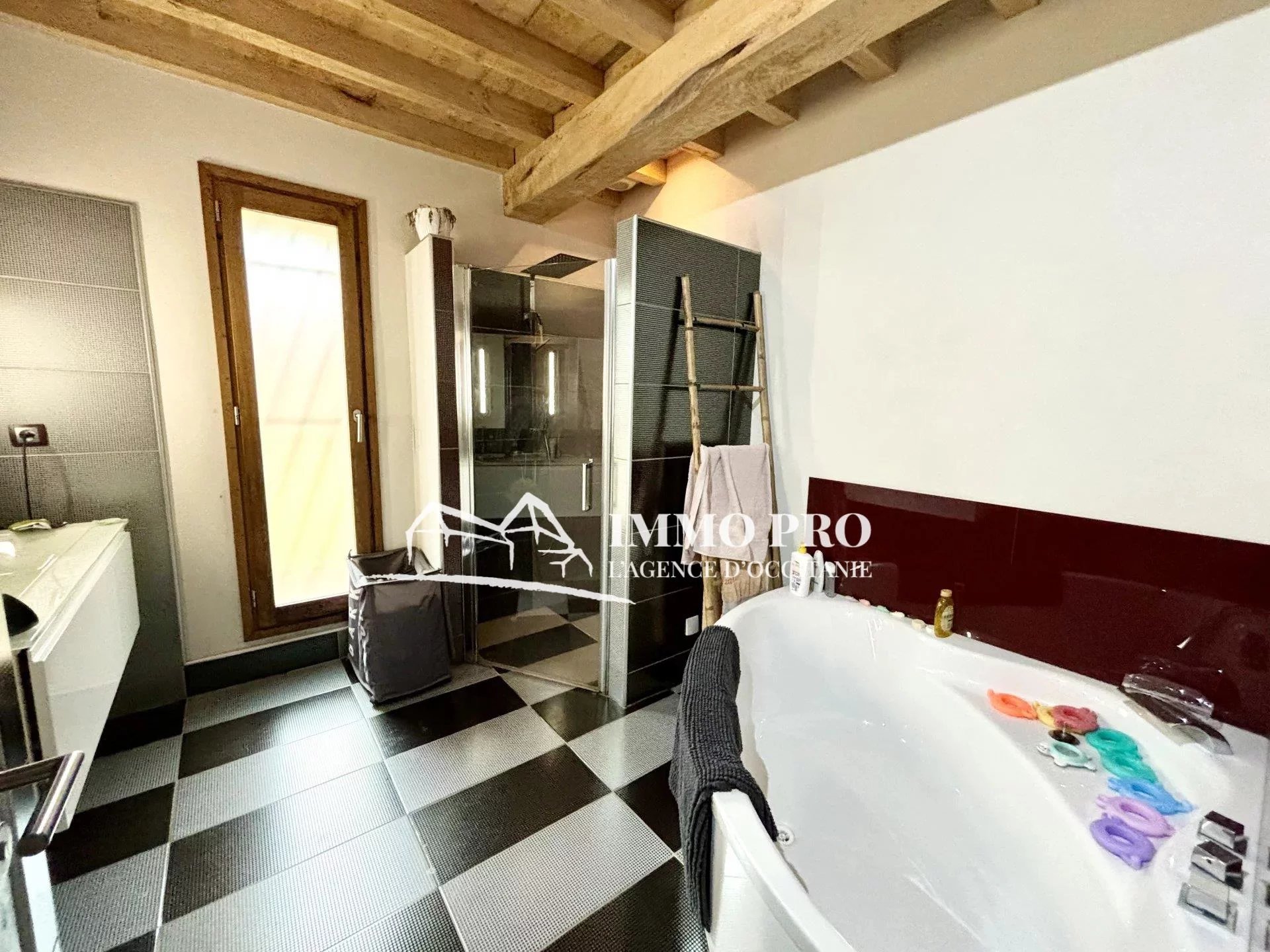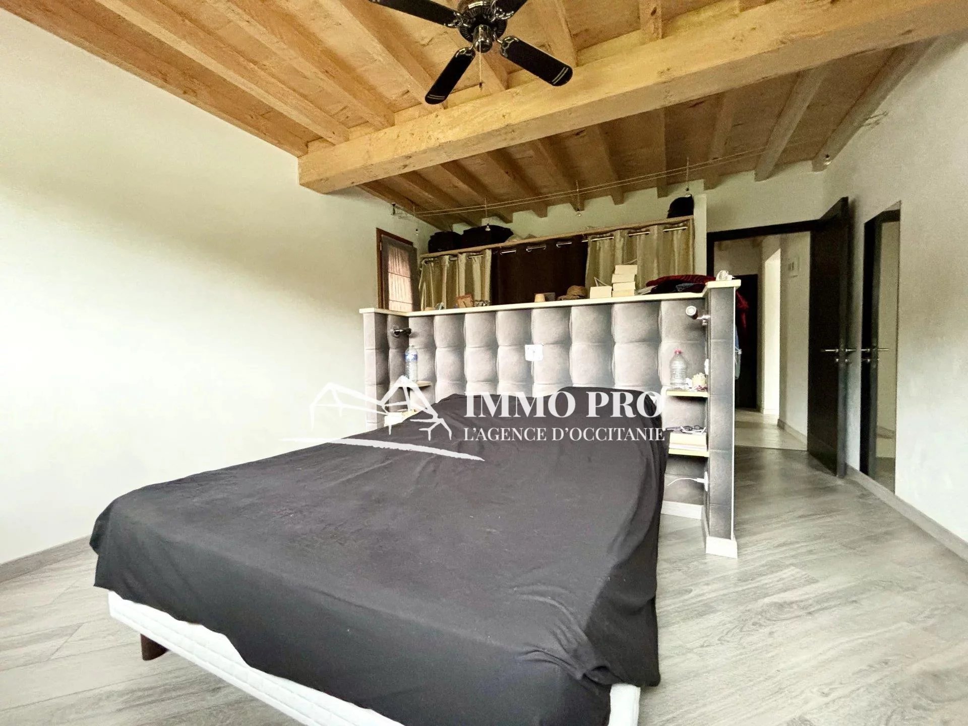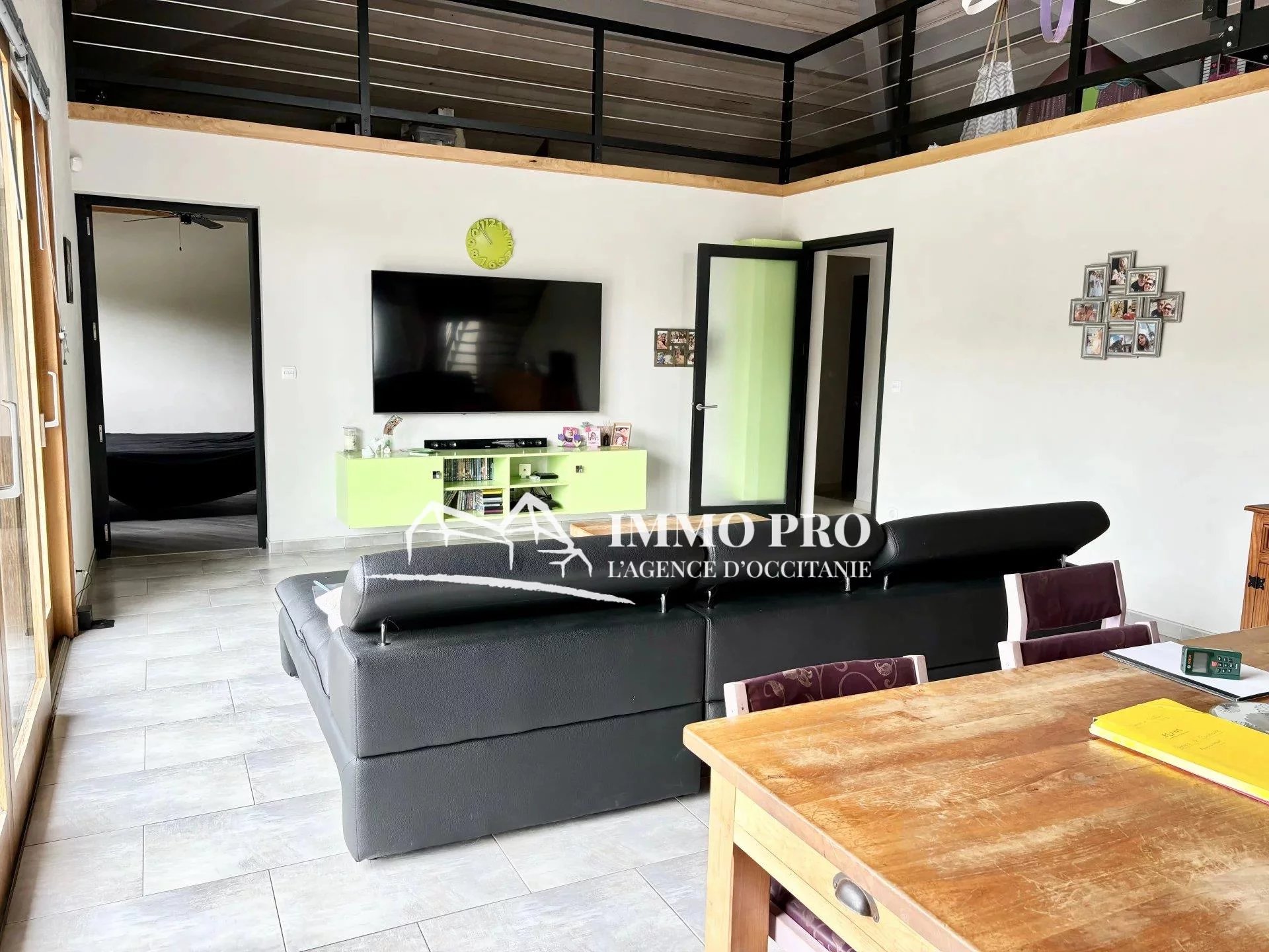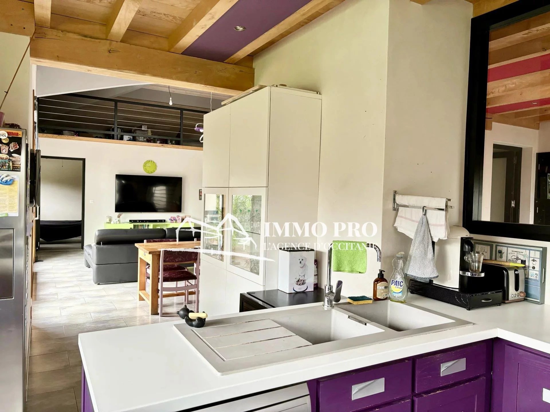 A 5mn de Gimont, Villa de plain-pied de 2010 – Belle entrée (placards), spacieux séjour avec toit cathédrale donnant sur une terrasse avec piscine exposée Sud, cuisine équipée, 4 chambres, dont une avec sa salle d’eau, salle de bains avec douche italienne et baignoire, 2 toilettes. A l’étage, grande mezzanine.