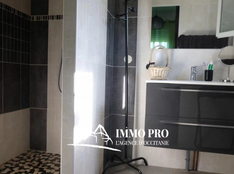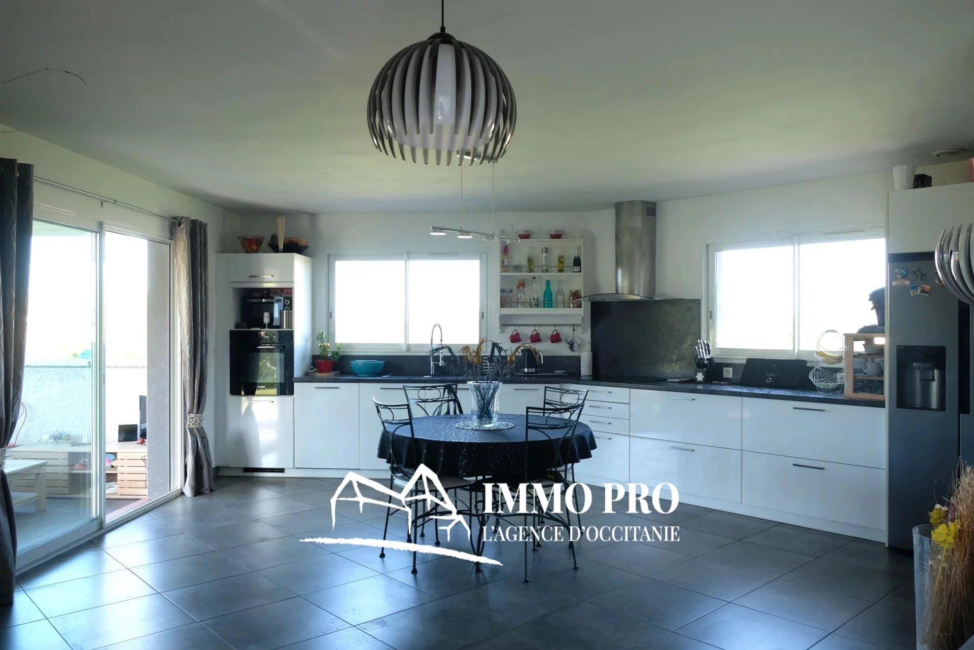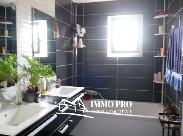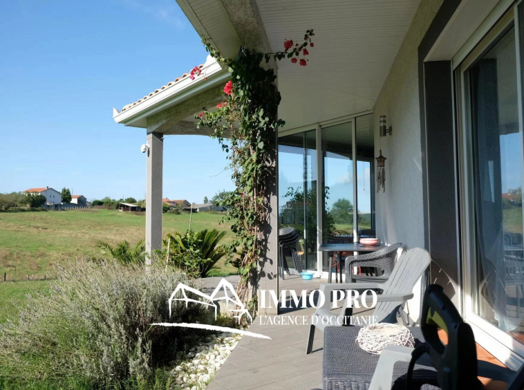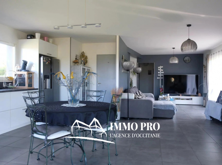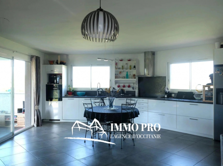 Spacieuse et lumineuse pièce de vie avec cuisine équipée ouverte sur le séjour donnant sur une terrasse abritée. 3 chambres, dont une suite avec dressing et salle d’eau, toilettes indépendantes, et salle de bain avec toilettes.