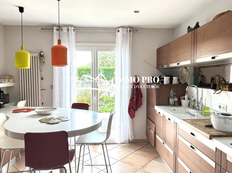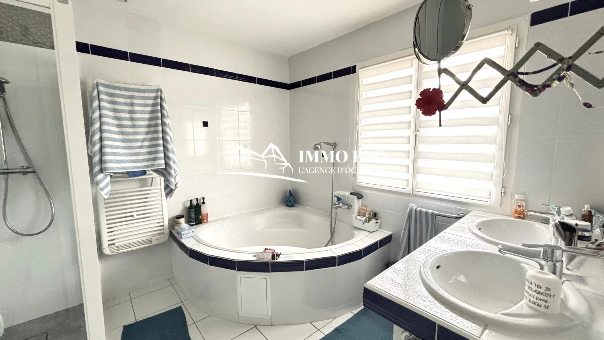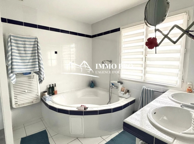 Venez découvrir cette jolie villa de 178m2 habitables comprenant au rez-de-chaussée une entrée avec placards, un séjour de plus de 60m2 avec cheminée, cuisine entièrement équipée, deux chambres, salle d’eau, cellier, buanderie et deux toilettes.